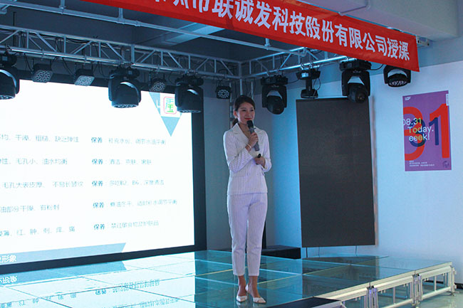 在护肤方面,霍美玲老师也是颇有心得,PPT演示了不同的肤质护肤的步骤及保养的方式,同时还对参与培训的人员所提出的护肤问题进行了详细的讲解。